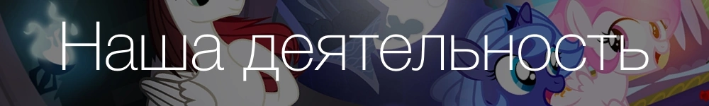 ТО "Магия Дружбы"Творческое объединение "Магия Дружбы" - это компания креативных друзей, творческих Брони разного профиля.Мы айтишники, дизайнеры, ютуберы и не только. Мы занимаемся видеоконтентом, а также компьютерной графикой и понификацией компьютерных программ и игр. Мы храним лучшие традиции мировой брони-культуры и применяем их для русскоязычного населения планеты. Нам не приходится скучать: творческих идей у нас даже больше, чем времени на их реализацию - поэтому, нам всегда есть чем заняться и следовательно занять всех знающих нас Брони. ![]()